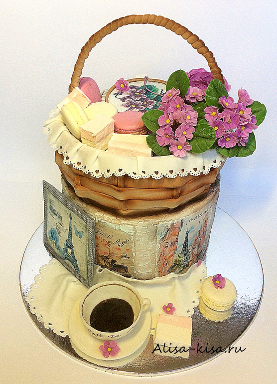 Торты для женщинТорт для женщины, которая осуществила свою мечту побывать в Париже и очень дорожит своими воспоминаниями.. На торте отражены самые дорогие ее сердцу вещи - двухцветная пастила, фиалки, вышивка, чашечка кофе из парижского кафе и виды старого города