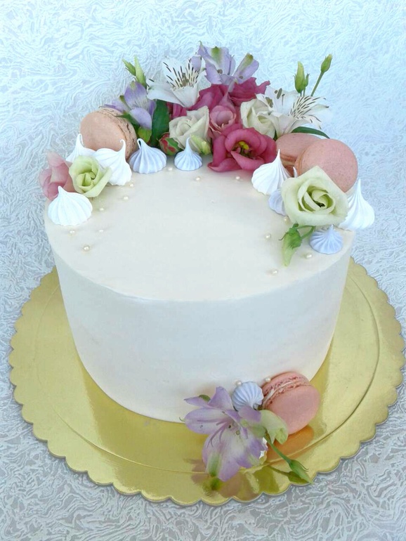 Очень нежный и красивый! Вот завидую я заказам с живыми цветами! Мне что то не везёт, не хочет народ торт с живыми цветами, даже на свадебный. Видимо работает принцип, заплатил, сьем ВСЁ!