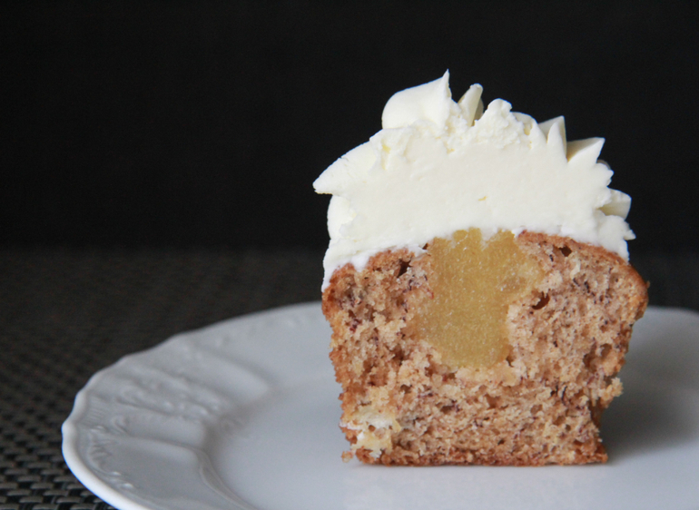 Сами капкейки банановые с кусочками ананаса (Колибри), ананасовым конфи и шапочкой кремчиза.