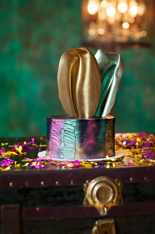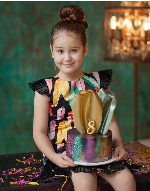 Дизайн торта подсказал наряд именинницы, черное платье с разноцветными перьями!