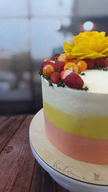 Украшение тортов кремом,шоколадом, фруктамиТортик на 3,3 кг. для яркой женщины, которая любит желтые розы и боулинг в 70-то лет! Фисташковый с малиновым конфи, крем с маскарпоне и Бейлисом. Подкатом фото разреза и моя примерка к новому фотофону)