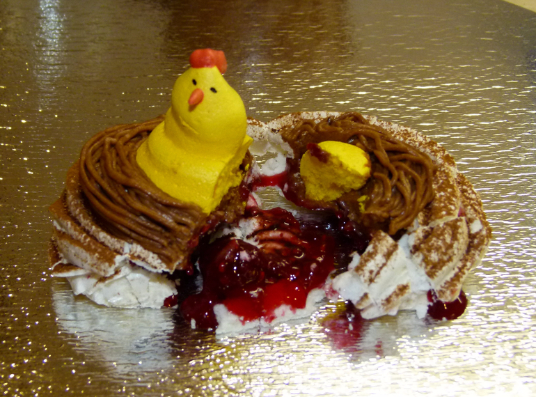 дети весь вечер спорили курочка это или петушок, сошлись на том - что это птичка . корзинка простого безе или шоколадное или обсыпаное какао. малиновая начинка придает легкую кислинку . крем - чиз и птичка-безе