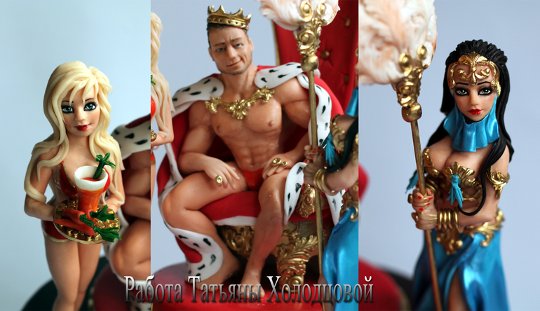 Восхищению нет придела!!!! Я вообще-то не имею морального права вас критиковать, но вот мне прям хочется этих двух дам убрать с торта, они великолепны, но они лишние.... Торт и король на нем настолько круты и самодостаточны! что ничего и никого больше и не нужно.