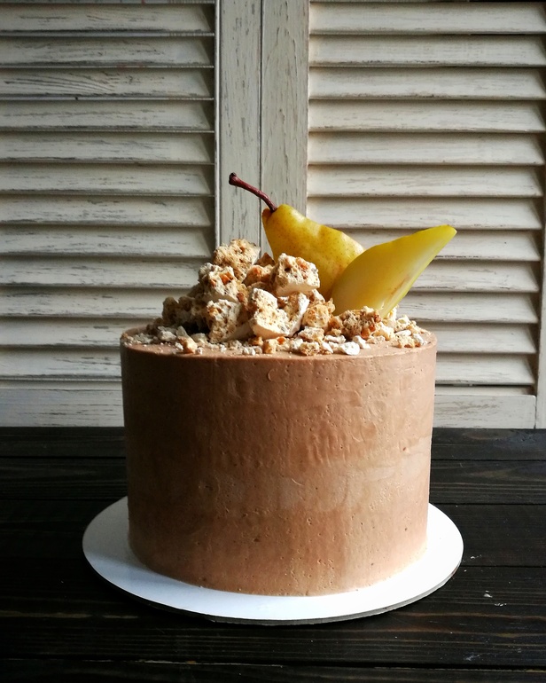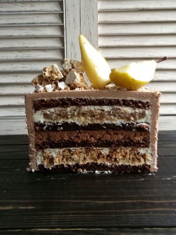 Здесзь шифоновый бисквит с орехами, ореховое безе ( не тающее😁), крем на основе темного шоколада и медовая груша. Покрыт кремчизом с молочным шоколадом и какао. Очень популярный торт у меня))