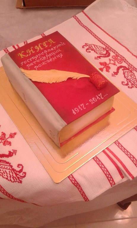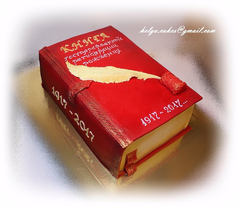 Торт попросила сделать моя близкая подруга, которая работает в отделе ЗАГСа, по просьбе ее начальницы. Книга планировалась выставляться на конкурсе работников ЗАГСа, в связи со 100-летием уважаемого заведения. Мне прислали эскиз торта от руки, с указанием где и какие надписи должны быть на книге. Обозначили цвет. Остальное на усмотрение. Вчера часов в 20 приехала подруга, повосхищалась тортом, попили кофе, я доделала последние надписи по боку. Сфотографировала. Фотку отправили по вотсапу работникам загса и начальнице. Все выразили своё одобрение, кроме ... руководителя. Высказано было многое моей подруге, подробности опустим... из главного - "такой торт на выставку нельзя, нас засмеют"; "я же просила нормальную книгу актов, ты что не видела как она выглядит?" и так далее... Потом трубку бросили. Время 22 часа, сын болеет, начинает завывать. Сжимаем руки в кулаки, вытираем сопли детям, подруге и начинаем из конфеты делать... книгу актовой записи рождения)))