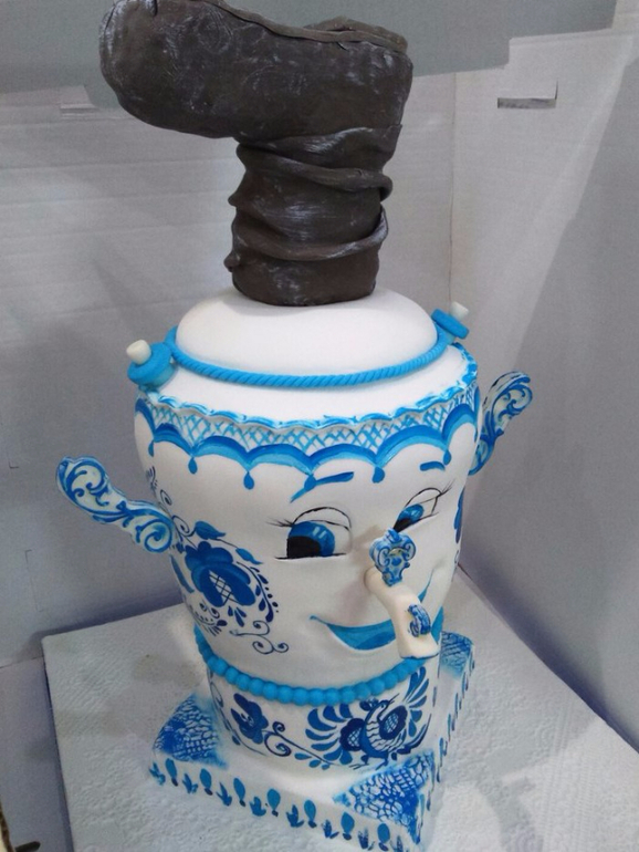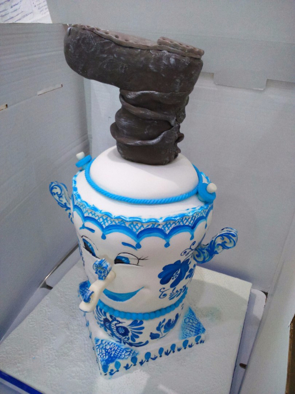 Самовар олицетворяет жену,старый потертый сапог-мужа,все по пожеланиям заказчика.Далеко не лучшая моя работа,но первый подобный опыт,вдруг кому тоже пригодится.Вес 6,5 кг.Сам торт на подставке,сапог из скульптурной массы.Торт не просел,это я так "ровно" обрезала..