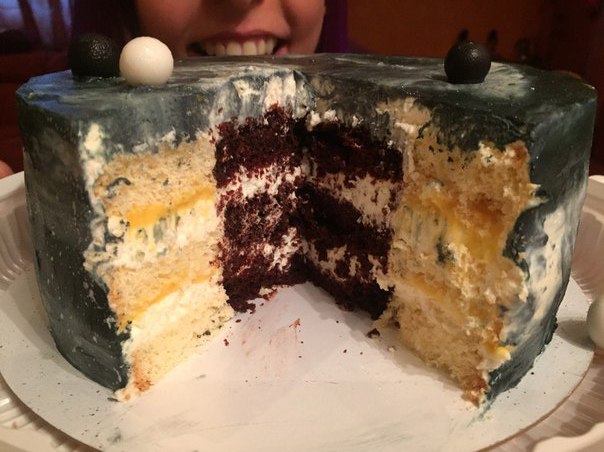 Внутри 2 восхитительных вкуса: 1. Насыщенный, яркий на вкус, шоколадный торт с мятным крем-чизом с кусочками свежей мяты и молочным ганашем; 2. Тропический торт с нежнейшими кокосовыми бисквитами, сливочным кремом и курдом из маракуйи (нам скинули очень позитивные фотографии с праздника и собственно сделали пару фоток с нашим тортиком и его разрезом