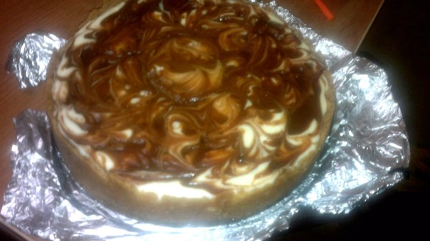 Я растапливала шоколад, ммешивала со сливками так, чтобы масса в кастрюле была не Однородной, а разных цветов, потом это ложкой наливала на чизкейк и китайской палочкой делала разводы. А потом уже выпекала. В реале вид намного лучше, чем на фото, но треснул при выпечке.