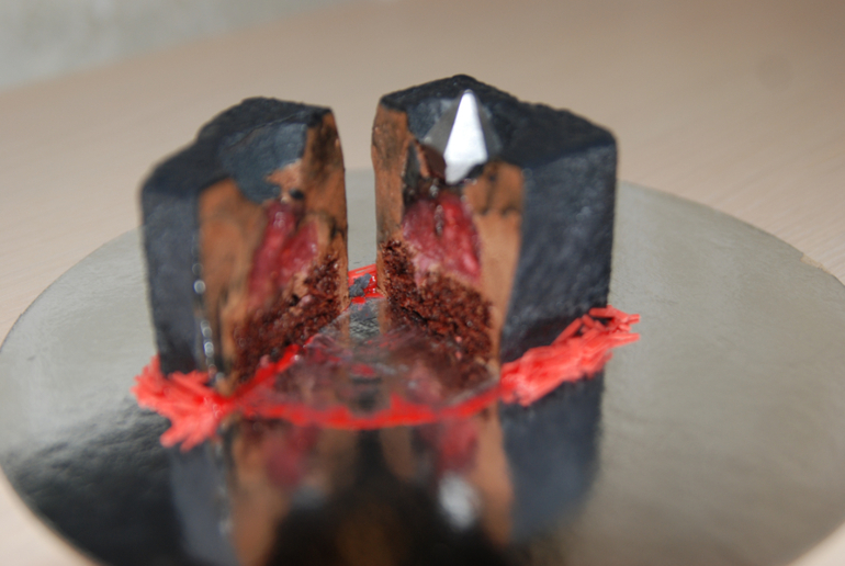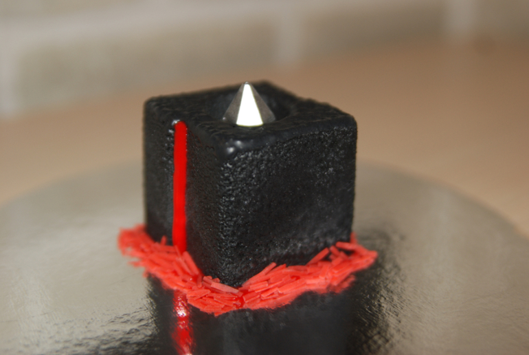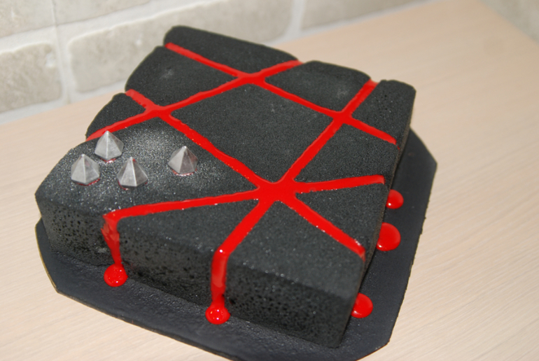 Состав простенький. Бисквит темный ларри, вишневое конфи, шоколадный мусс. Велюр, зеркалка, шоколад, кандурин.