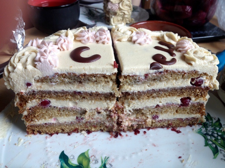 Внутри бисквит "Королевы Виктории", клюквенный домашний джем, клюква, крем Пломбир + использовала остатки крем-чиза с малиной от прошлого торта, буквы - шоколадная глазурь. Общий вес 2,7 кг. Бисквит и крем были приготовлены из тростникового сахара, поэтому цвет имеют карамельный.