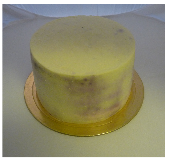 Тортик обмазала кремчизом, но к сожалению, не учла что моя пропитка из черничного мусса, будет просачиваться наружу. В первый вечер после обмазки, тортик выглядил беленьким, а вот на второй уже потемнел и появились трещенки. ((