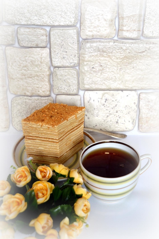 А мне очень понравилось как на фото перекликаются полосочки на разрезе медовика и полосочки на чашке и блюдце. Удачный кадр на мой взгляд!