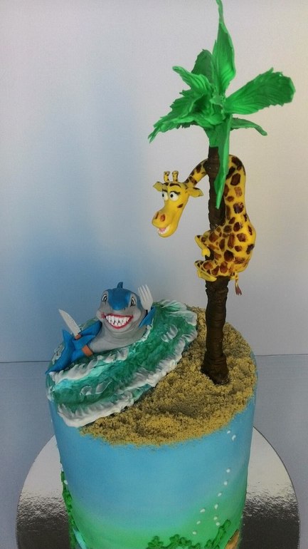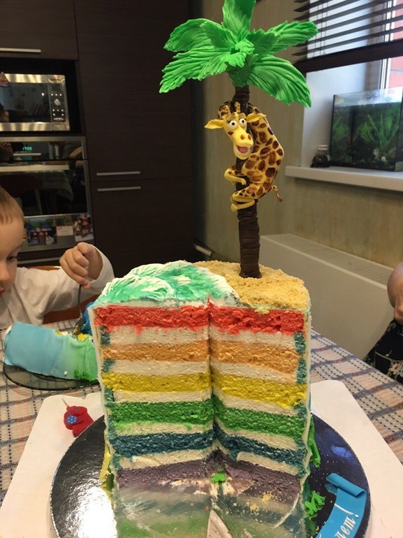 Идея торта придумана самими родителями, я только воплотила в реальность их задумку, очень интересный получился торт c радужной начинкой, высота торта с пальмой 45см., вес 3,5кг.