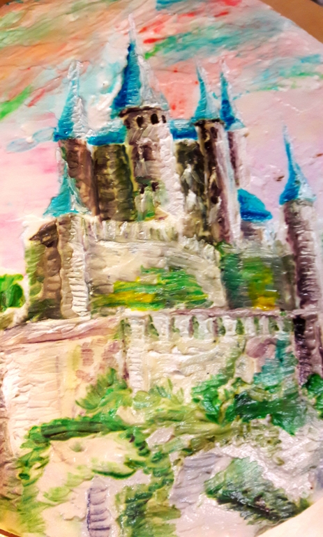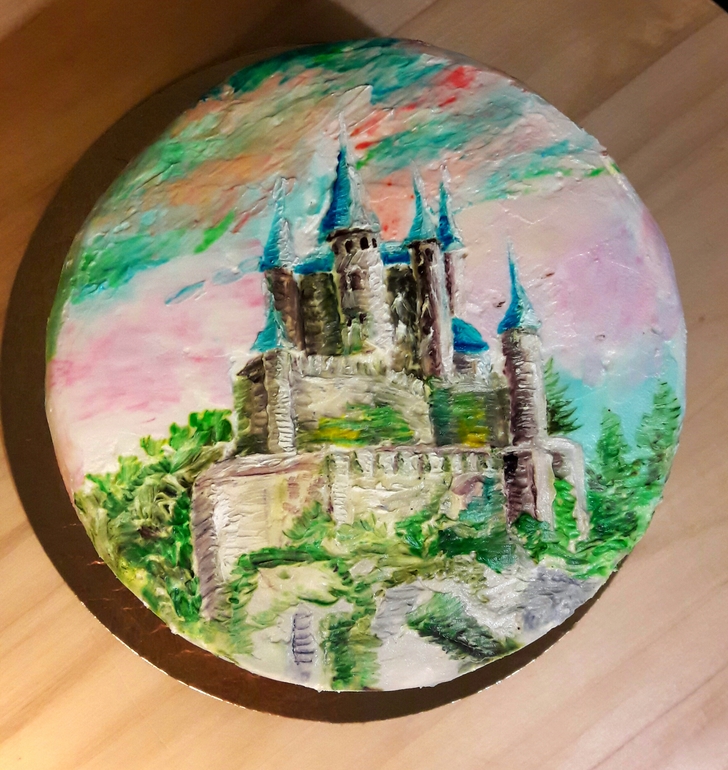 Рисунок с замком на поверхности торта очень красивый! Из всех Ваших работ он мне больше всего нравится! Жаль, что такая неприятность с тортиком случилась ((((