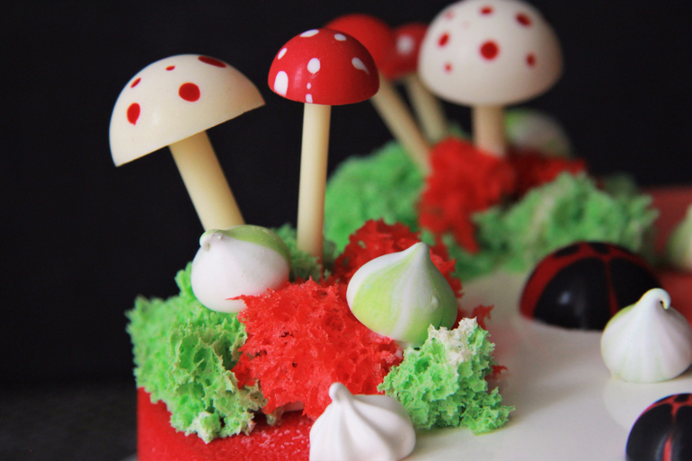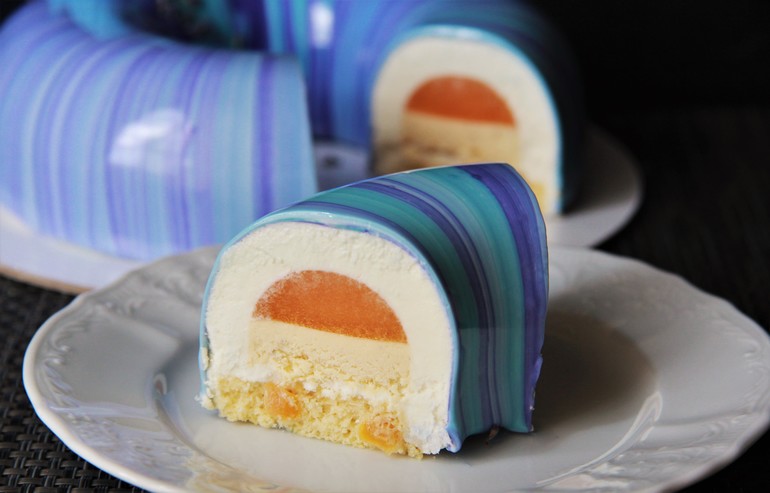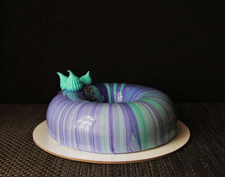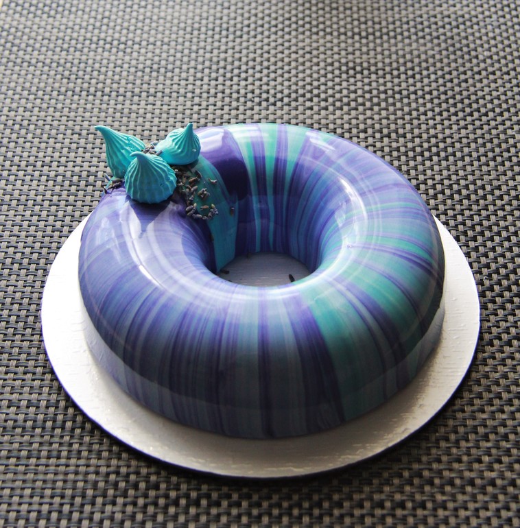 Итак, персик-лимон-лаванда. Пан де жен с цедрой лимона и курагой, персиковое конфи, лавандовое креме и мусс с лимоном и лавандой. Получилось неплохо, но надо еще поработать с балансом. Лаванды маловато. Боялась переложить...