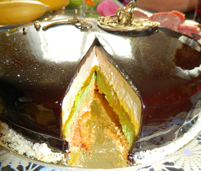 Внутри миндальный бисквит "Джоконда", инкрустированный в мусс на чае EarlGrey, придает слою терпкие ноты орехов и бергамота, нежное фисташковое кремю на шоколаде и сливках дополняет ореховую композицию, не перебивая ее; ананасово-лаймовое компоте придает сочетанию мягкость и сочность фруктов; мусс "Альпийский"(авторский рецепт) дополняет вкусовую композицию невероятным сочетанием трав и сливочной основы, легкого мятного ветерка и буйства красок природы; а завершает летнюю симфонию бархатный финальный аккорд зеркальной карамельная глазури и темного шоколада. Вес 1,9кг.