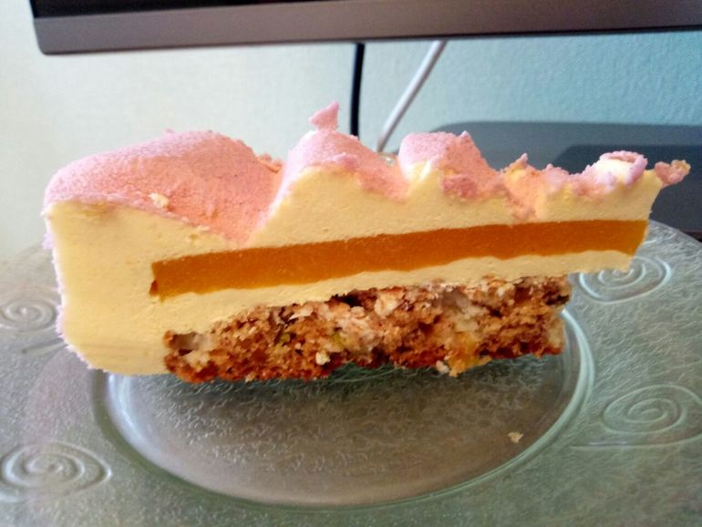 Телефонофото с праздника, кусочек бисквита отвалился((. Толстенький корж Колибри с бананом, ананасом и фисташкой. Тонкий хрустящий слой кокос - белый шоколад - вафля. Конфи манго. Мусс с маракуйей. Шоковелюр.