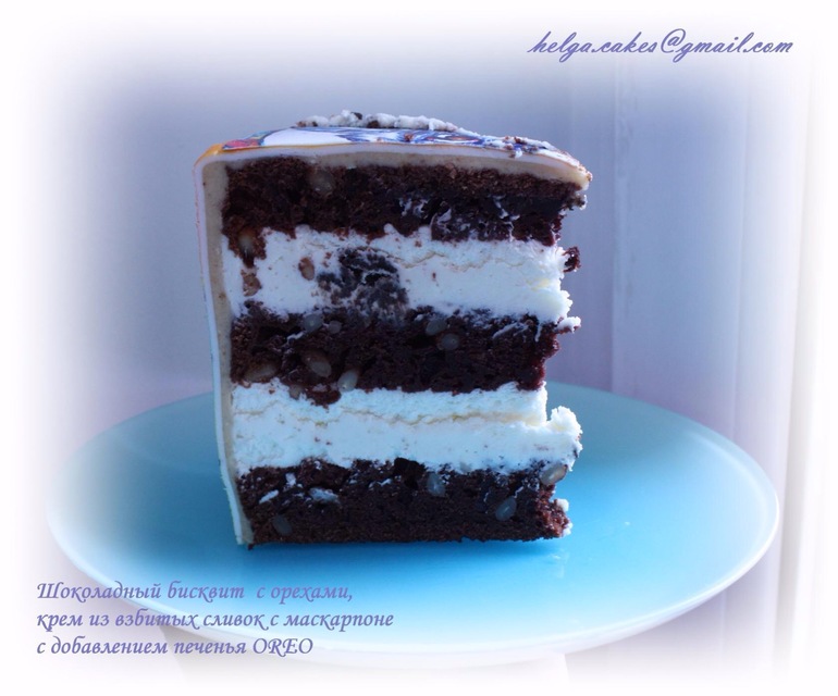 На оформление торта у меня был ровно 1 час, пока дети возвращались с квестов. Внутри шоколадный бисквит с кедровыми орешками, крем сливки с маскарпоне и печеньем Орео.