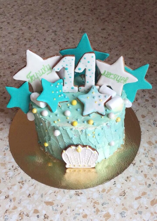 Для домашнего торта вполне прилично. Соглашусь с Леной, что с декором перебор и на мой взгляд звезды слишком крупные для такого небольшого пространства,их очень много- 3-4 было бы достаточно.,учитывая, что еще цифры ,корона и бусины. здесь главное вовремя остановиться.. много-не значит красиво)))..гамма хорошая