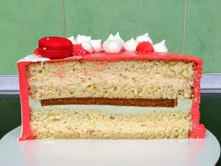 Бисквит классический с абрикосовой пропиткой; абрикосовый мусс на pate-a-bomb; фисташковый баварский мусс; абрикосовый мармелад