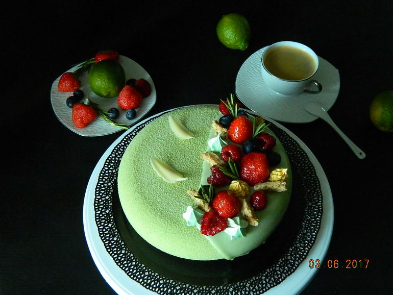 Кокосовый крокант, кокосовый бисквит, ванильно-лаймовый мусс, ананасово-лаймовое компоте. Декор: шоколадный велюр, глазурь, ягоды, кусочки кокосового кроканта, меренга
