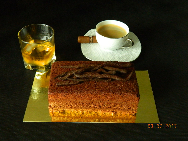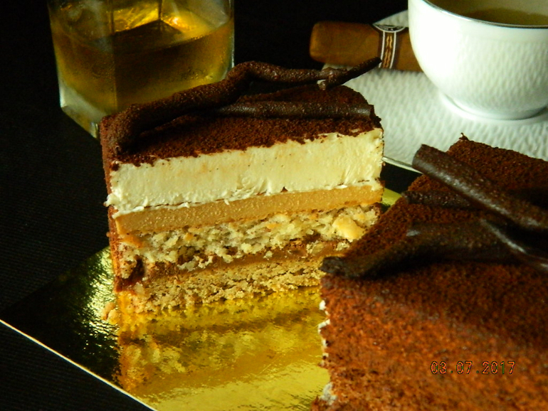Состав: Штрейзель с фундуком и миндалем, шоколадный ганаш с виски, ореховый бисквит миндаль - фундук, карамельное кремю с табаком, ванильный мусс. Остальное под катом