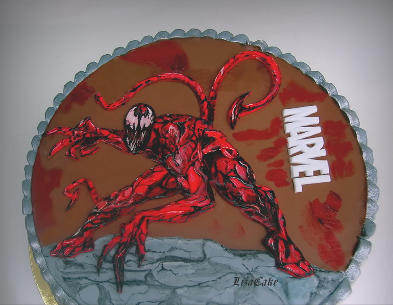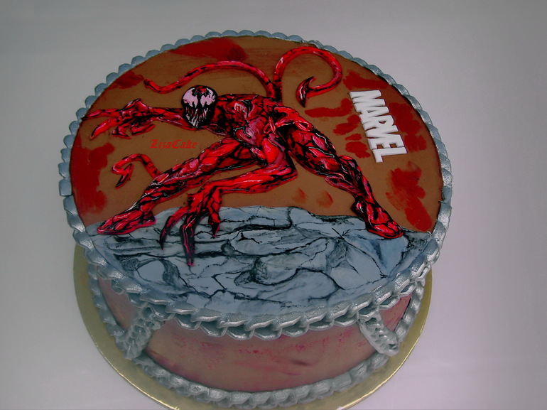 Конечно же намного более эффектно он смотрелся бы в качестве фигурки, но в данном случае с фигуркой пришлось подождать и ограничиться аппликацией, перенеся торт с объемным Карнажем "на потом".. А он будет.. рано или поздно, но будет.. Парень, для которого делался данный торт, является фанатом как Человека Паука, так и Венома с Карнажем, причем последних двух любит больше Питера Паркера)