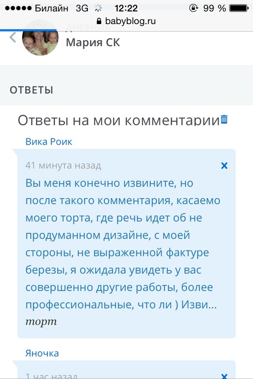 я вообще ничего против не имею, любое мнение имеет место быть, и ответила совсем без хамства. просто я к тому, что если высказывать свое мнение и указывать на чьи-то ошибки, так тогда тот человек, который это делает, должен в несколько раз лучше сделать то, на что он указывает и о чем он говорит, у него должны быть работы к которым не придраться, вот и все. да и это касается не только тортов