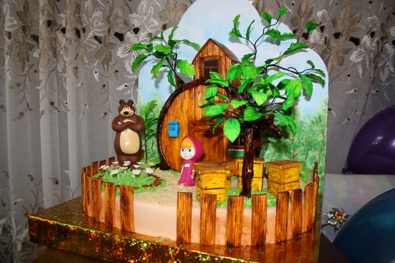 Все остальное торты.Листья,улики,забор и цветы из цветочной мастики,остальное покрыто желейной мастикой. Я живу в Донецкой Народной Республике, положение людей,можно оценить словом - нищее, лепить фигурки из модел паст это слишком дорогое удовольствие.Сейчас не по карману.