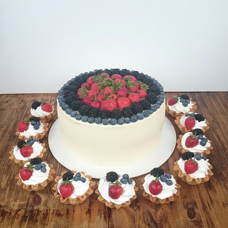 Украшение тортов кремом,шоколадом, фруктамиТортик в общем-то обычный, белый, гладкий с ягодками. К торту были ещё корзиночки песочные, с начинкой из малины с сахаром, заваренной крахмалом (как начинку для пирожков делают), белковый крем и ягодки.