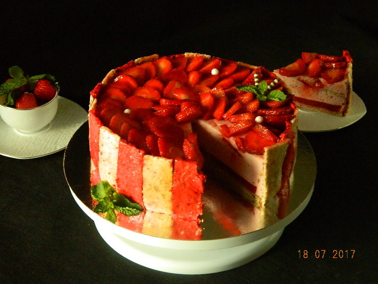 Чем проще кажется рецепт тем больше я в нем сделаю косяков))) А сложные торты с первого раза часто без сучка без задоринки удаются.) Наверное понимая сложность сосредотачиваюсь, а в других случаях расслабляюсь. Впрочем удовольствие я все равно получила от процесса, вкус оказался ошеломительно насыщенно -клубничный, текстура нежная и воздушная,а мята мягким шлейфом окутала всю эту гармонию. Очень понравилось прослойка из желе (красная смородина, малина, клубника, мята) Она дает очень насыщенный и интересный вкус за счет комбинации ягод.