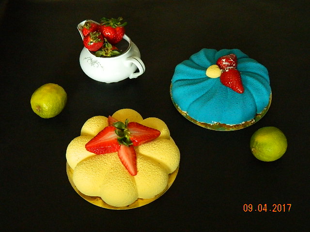 Состав: Кокосово-лаймовый бисквит Дакуаз, фруктовое желе (апельсиновый и лаймовый сок, банан, манго, ананас),мангово-лимонный баварский мусс, лаймовый баварский мусс.
