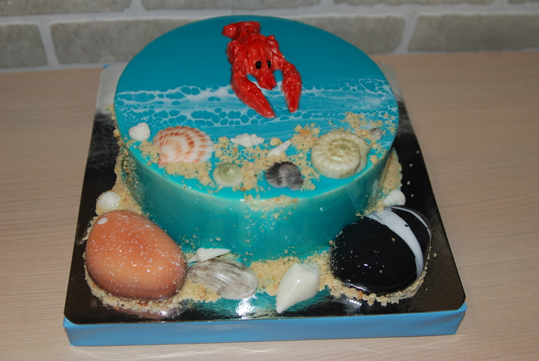 Причем, по требованию заказчиков, на море присутствуют странные элементы. Ну, ок, рак еще уместен (именинница по гороскопу - Рак, обыграли вот так эту тему). Но вторая именинница увлекается фитнесом, а потому на морском торте у нас - гантели. Как говорила Алиса, "все страньше и страньше"...