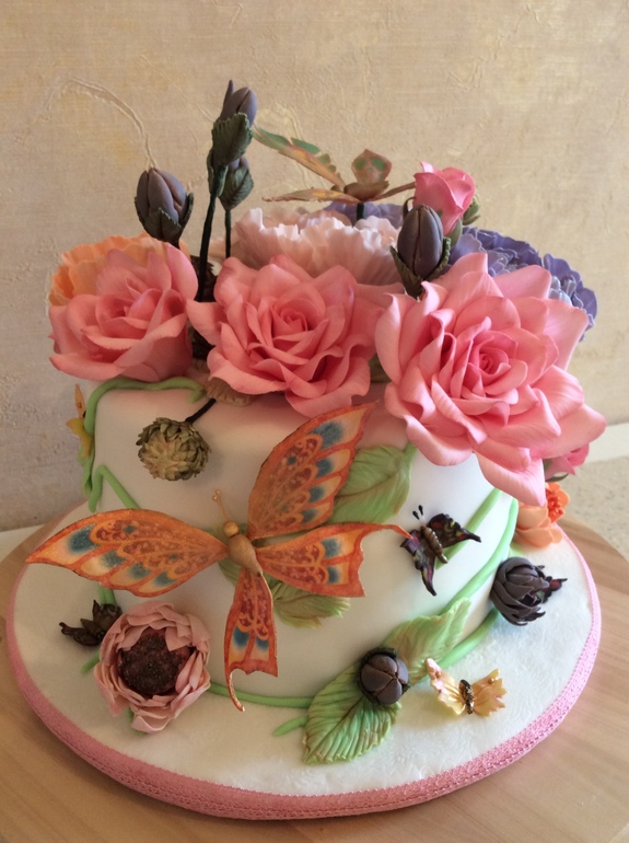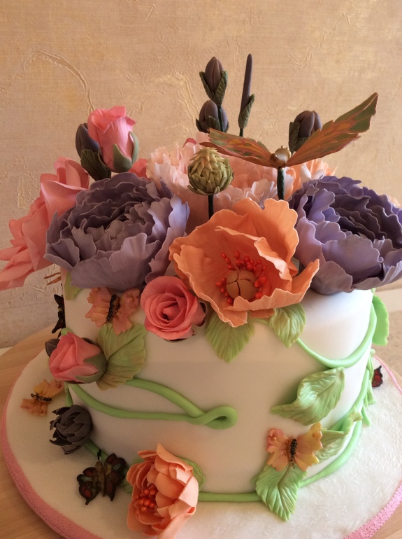 Спасибо! Подложка покупная фольгированная 13 мм толщиной покрыта мастикой. Цветы сделаны из цветочной мастики Bakels.