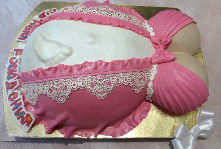Видимо у именинницы могучее чувство юмора - разрезать "Беременный животик" на много кусочков, кому с ножками, кому с ручками, ну сиськи ещё ладно, и сожрать в компании с близкими людьми. Ой, а я глазик малыша съел)))