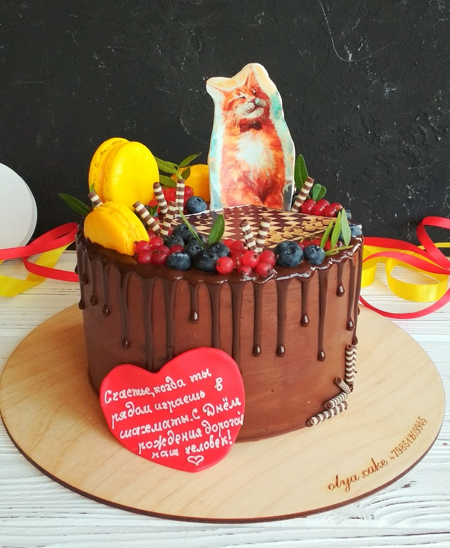 Украшение тортов кремом,шоколадом, фруктамиВот один из сегодняшних, интересный тортик для любимого мужа, любящего играть в шахматы😍..