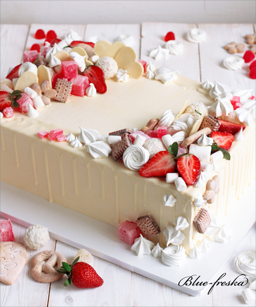 Я так и не смогла её разговорить, она ела мой торт на свадьбе, её интересовало только чтобы начинка была та же самая. А сверху - как хотите, вам виднее, сделайте красиво. Предложила фрукты/ягоды - ок, безешки - ок, крем - все ок, сами решайте, главное чтобы вкусно и красиво.