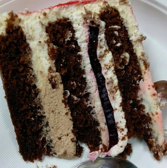 На нашу с мужем 10 годовщину свадьбы. Шоколадный бисквит, крем-чиз, взбитый ганаш на молочном шоколаде и прослоечка вишневого конфи. Разрез под кат