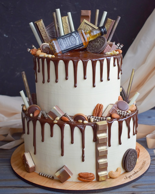 Украшение тортов кремом,шоколадом, фруктамиВот он шоколадный тортик на юбилей 👌 директора с бутылочкой настоящего, оригинального виски Jack Daniels!!
