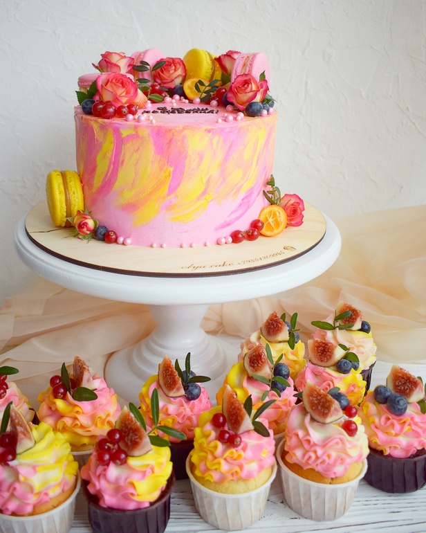 Украшение тортов кремом,шоколадом, фруктамиА на фото яркий и стильный тортик и капкейки для Дня рождения двух сестричек👩❤👩..