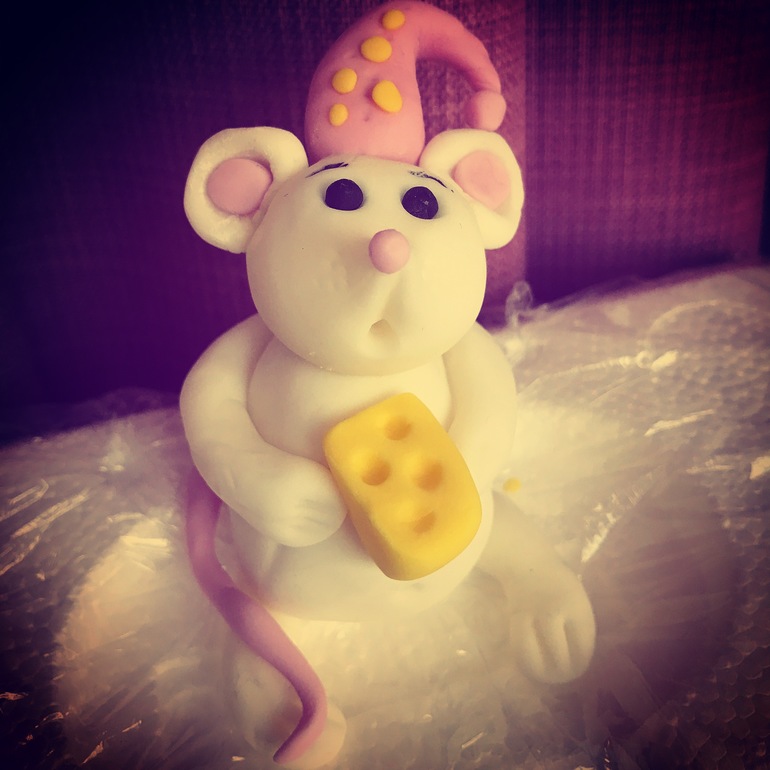 Наконец рискнула сделать фигурку из мастики. Выбрала мышонка, потому что дочке очень нравится этот герой из книжки про "котёнка по имени Шмяк". Конечно косяков много...но для первого раза вроде не плохо?