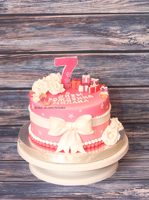 Девушка, заказавшая торт, решила сделать таким образом подарок на День рождения дочери подруги, поэтому никакой конкретной информации о ребенке узнавать не собиралась, исходя из этого..... никаких пони, собак, женщин на торте быть не должно было, но бант и подарки обязательны...)))