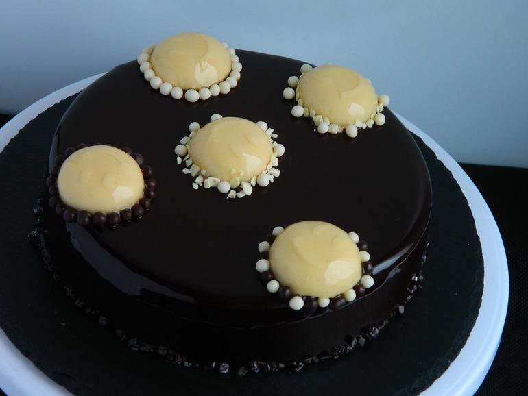 Состав: бисквит ореховый Дакуаз, бисквит шоколадный без муки, каталонский крем (с апельсином, лимоном, корицей), шоколадный мусс, зеркальная глазурь.