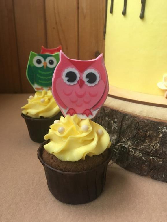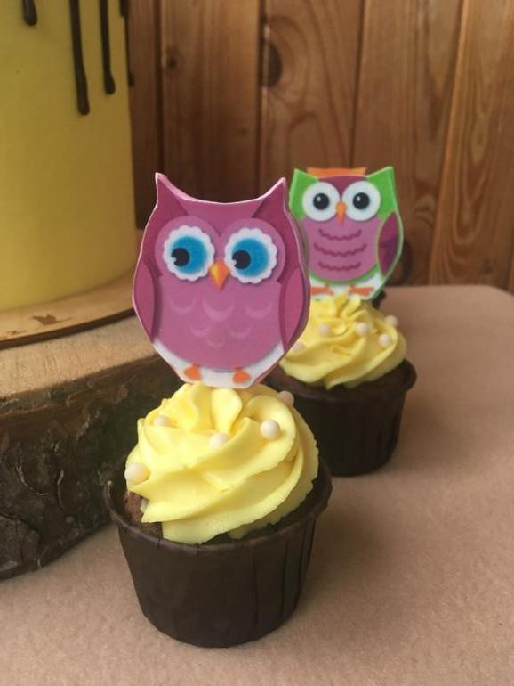 Небольшой кэнди барчик девчачий с совушкой, торт Три шоколада 5 кг, пряник 16 см с Совушкой и 18 шоколадных капкейков с клубничным курдом и кремчизом