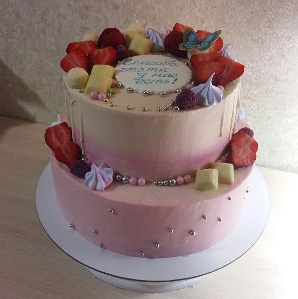 Тортик для мамы моей постоянной клиентки. Внутри - ванильный с клубничкой и белым шоколадом и МД с персиком, вес 4500