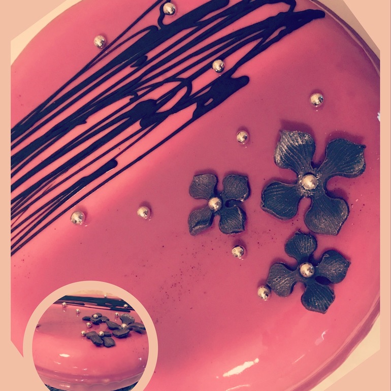 Первый мой эксперимент с муссовым тортом. На глазури видны точечки мелкие-это нерастворенный краситель, который заявлен как жирорастворимый(((