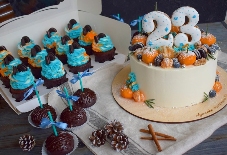 Морковно-ореховый торт с вишней 🍒 и кедровыми орешками и сладости в зимнем оформлении на День рождения!