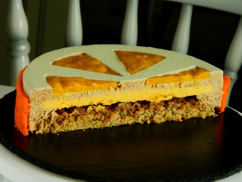 В торте мне понравилось все: фундучный бисквит с сахаром Мусковадо (стоимость 530рэ за 1кг 🤑 сахар крайне ароматный, яркий и влажный), очень воздушный и хрупкий хрустящий слой с пралине фундука и миндаля, мандариновый крем, мусс из фундука на молочном шоколаде и очень интересной текстуры, за счет использования пралине фундука, декоративный бисквит Рулад (вокруг торта) и совершенно замечательное желе из мандарина в декоре (это очень мандариново, фактически живой мандарин)