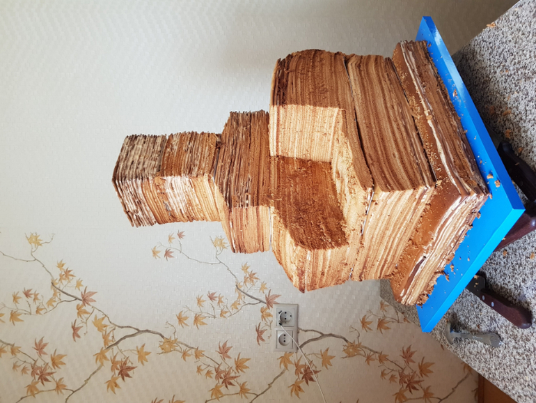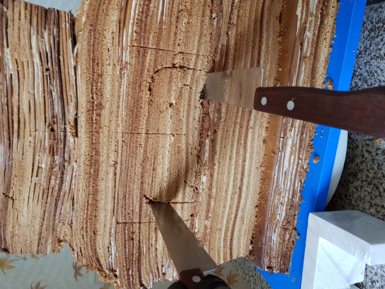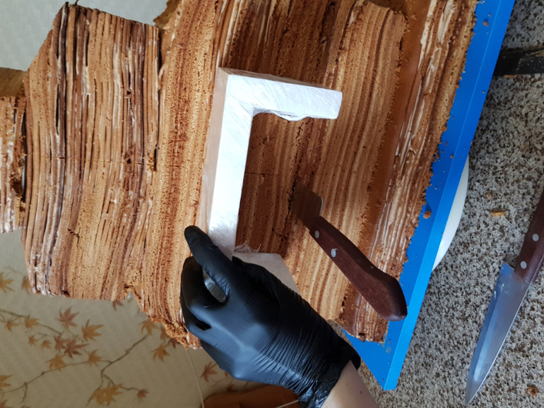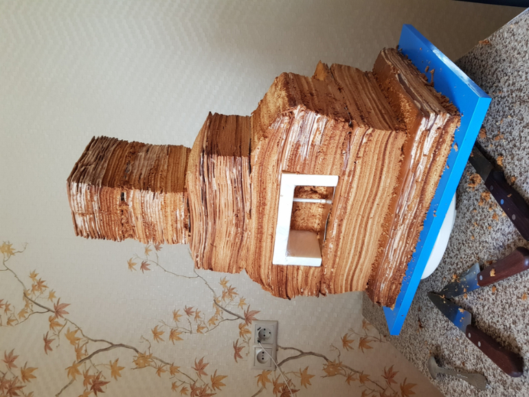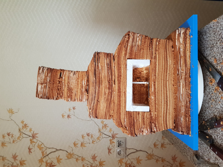 Начала собирать торт в четверг утром. Собирала в районе 8 часов. Промазать такое количество коржей оказалось делом небыстрым. А еще ж посуды помыть надо, крем приготовить. Достаточно долго его выравнивала и потом частями обтягивала. Швы затирались не очень хорошо, но неровности нарисовали в моей голове настоящую печку и я стеком еще их добавила.