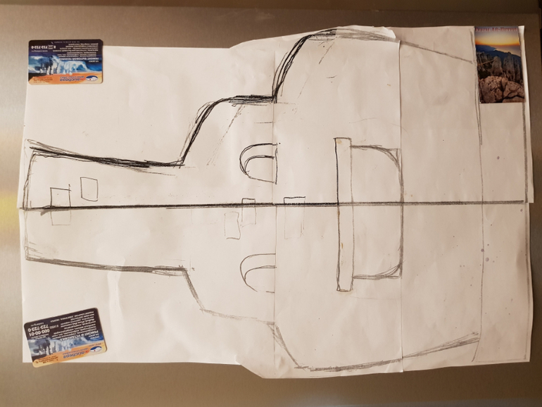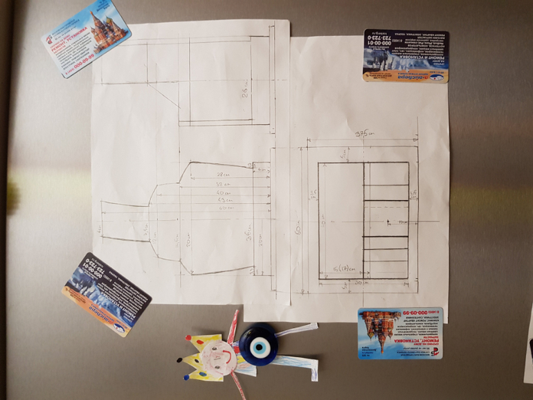 Торт был заказан за месяц, но ситуация осложнялась тем, что торт на 17, а 17 и 18 у меня МК стояли. Поэтому подошла к работе серьезно и за недели полторы начала готовиться. С чего начать? Торт тяжелый и большой. Какие размеры его могут быть? Надо в вес попасть и масштаб выдержать. Ответ пришел сам собой, когда открыла холодильник и поняла, что размер подложки не может быть больше, чем площадь холодильника. После этого была нарисована печка на А4, потом масштабирована под размеры холодильника. Опыт подсказал +- каким может быть размер печки, чтобы попасть в нужный вес. Подготовила чертеж в масштабе, что подсказало, какого размеры выпекать коржи и сколько.